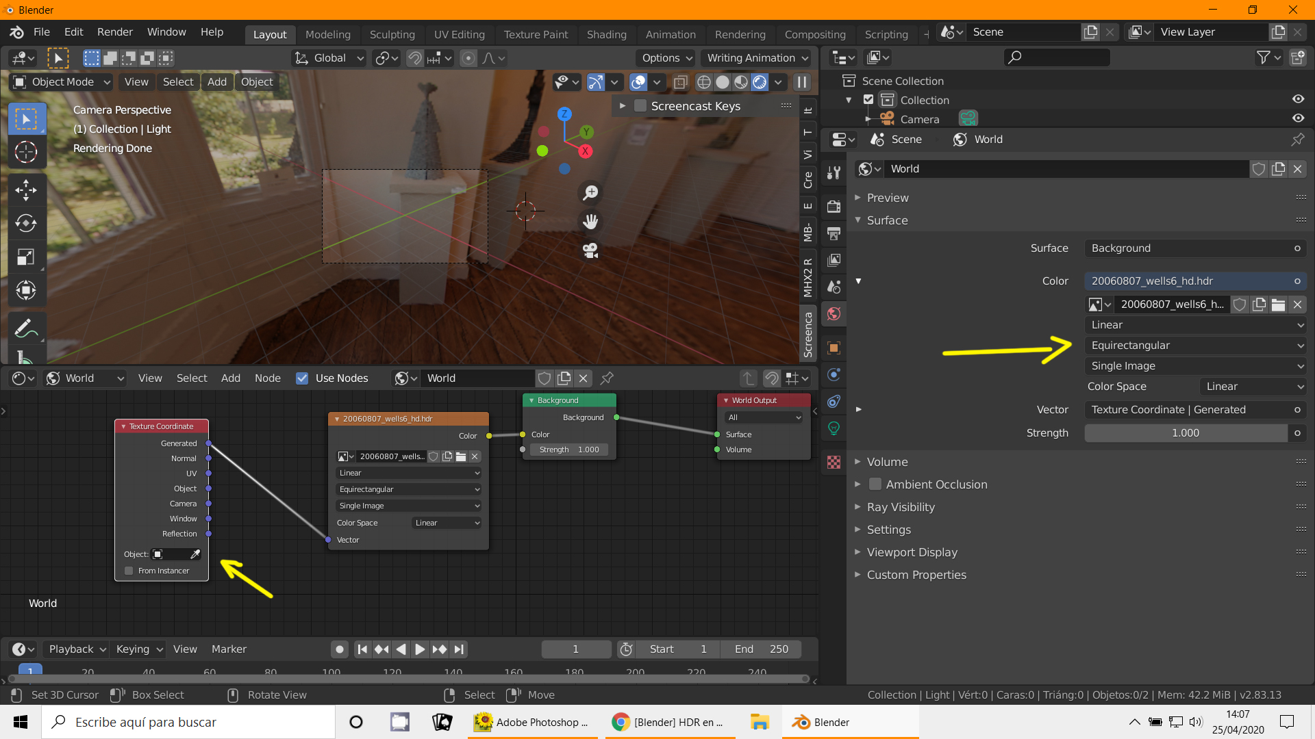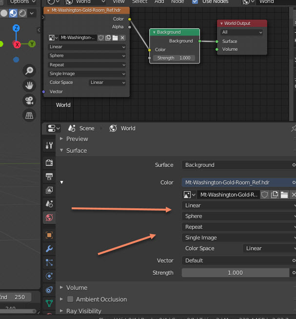 En el HDR, aunque no hace falta, se puede poner un nodo de tipo Texture Coordinate en Generated, pero eso es opcional o por si quieres con un Mapping rotar o mover la escena.