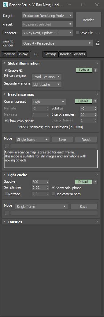 has tocado las configuración de Vray. Estas usando Irradiance Maps, por lo que llegado aquí tienes varias opciones. La primero es controlar el funcionamiento del motor de render, con ello podrás trabajar de acuerdo a tus necesidades, y solucionar los múltiples problemas que se puedan dar en distintas escenas y materiales.