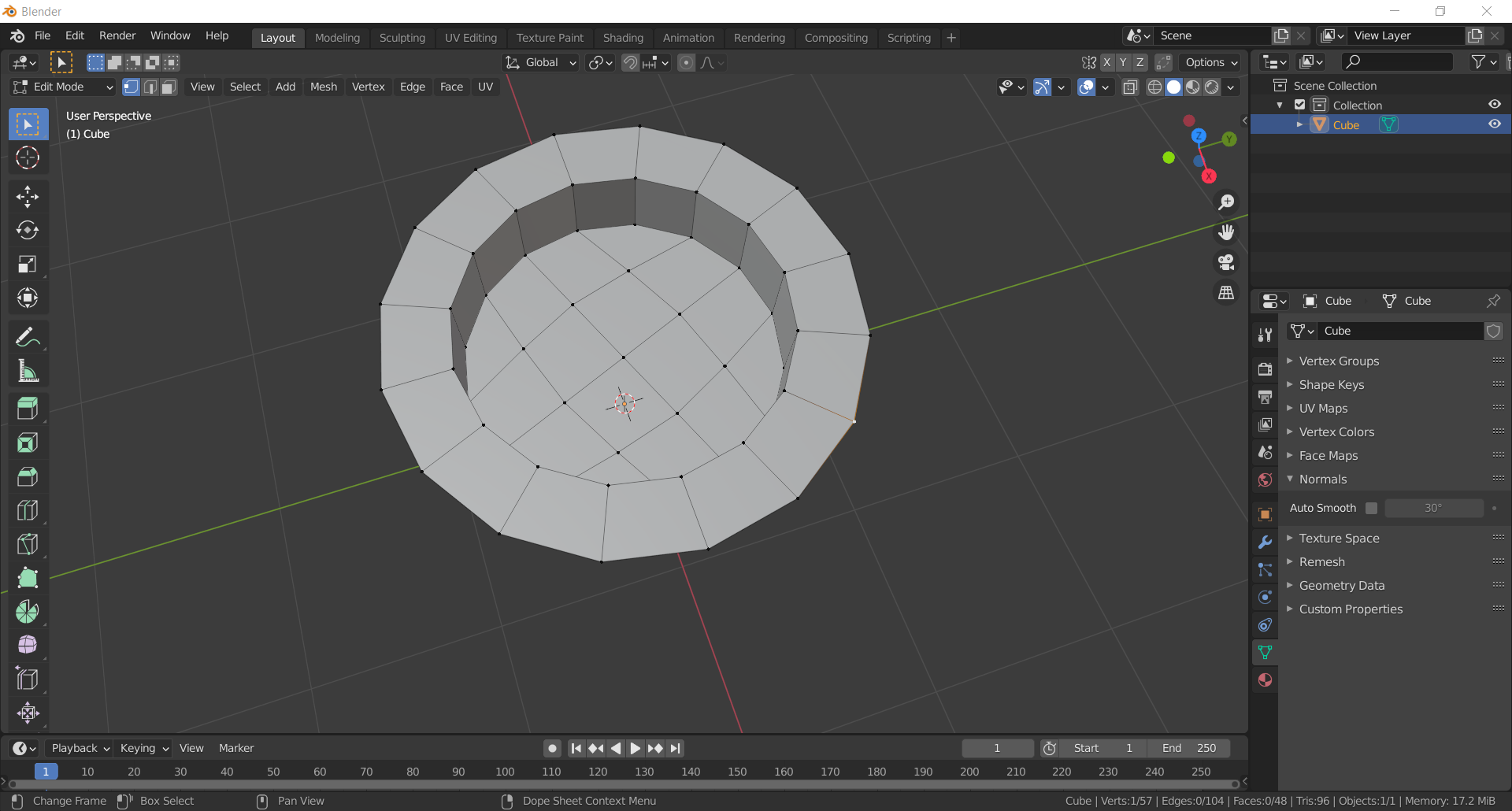 Justo después que le hace los loops, el cuadrado pasa a hacerse circulo, intenté hacerle un modificador de Subdivision Surface pero no me da un resultado tan bueno y no me interesa haga tantas caras en el resto del objeto.