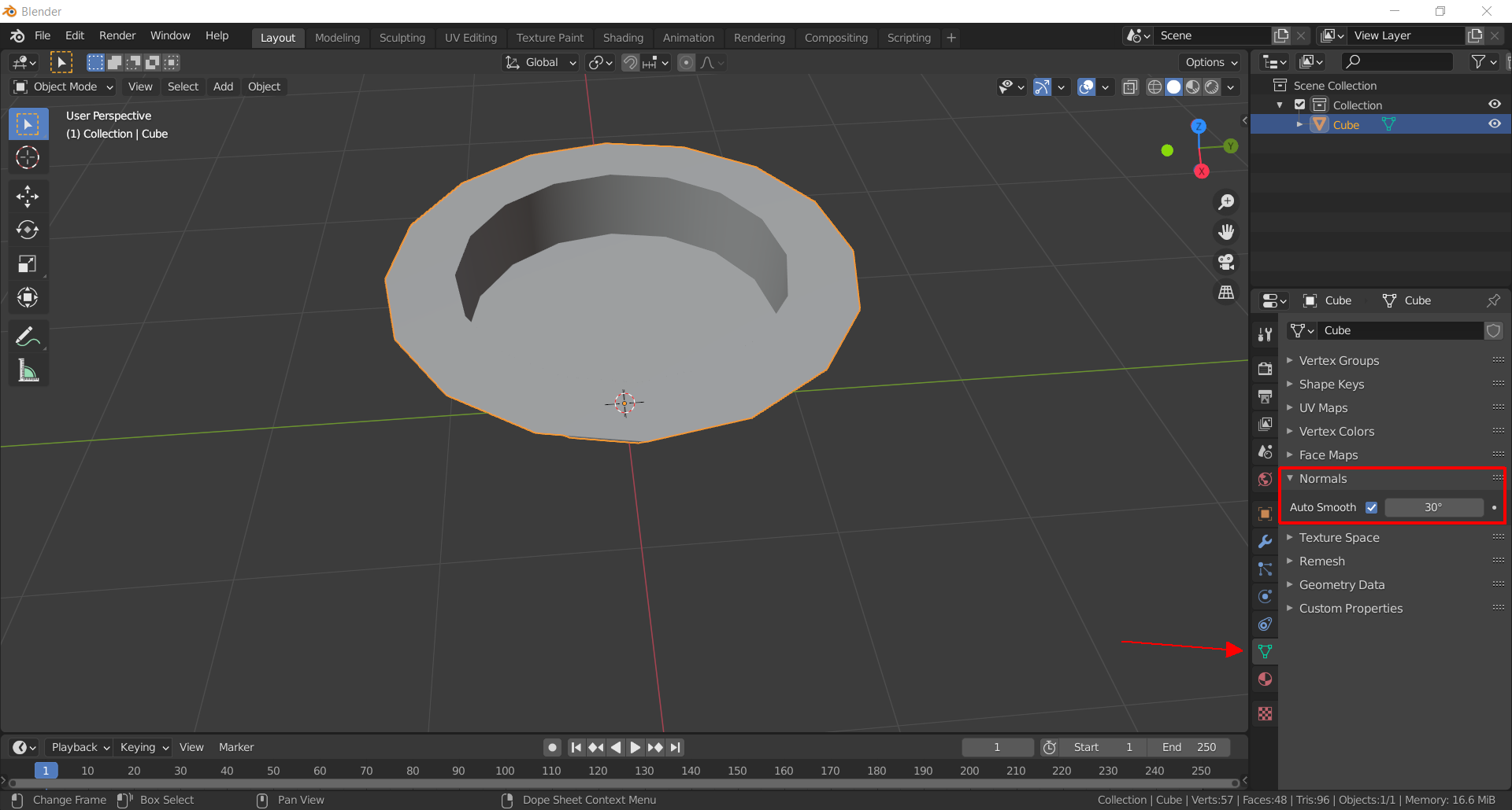 Ponemos las normales en Auto Smooth, el ángulo por defecto suele funcionar, aunque se puede aumentar o disminuir en función de lo que se necesite.