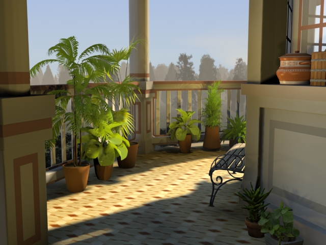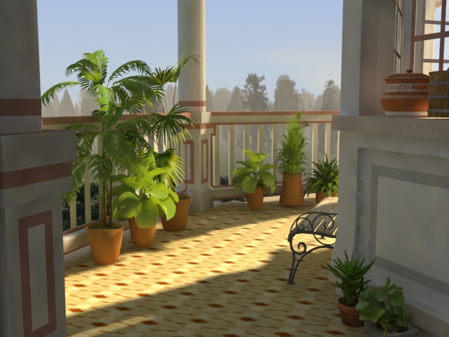 Bueno, lo prometido a mi amigo Strogoff, aunque con demora. Ocurre que no me decidía si hacer un interior o un exterior, y resolví hacer algo intermedio, el exterior de una casa en una cámara y otra cámara en una toma de la galería, teniendo esta segunda las características de iluminación interior, donde los numerosos rebotes son exigentes y muy evidentes, algo que no ocurre tan marcadamente en exteriores donde prima el efecto skylight.