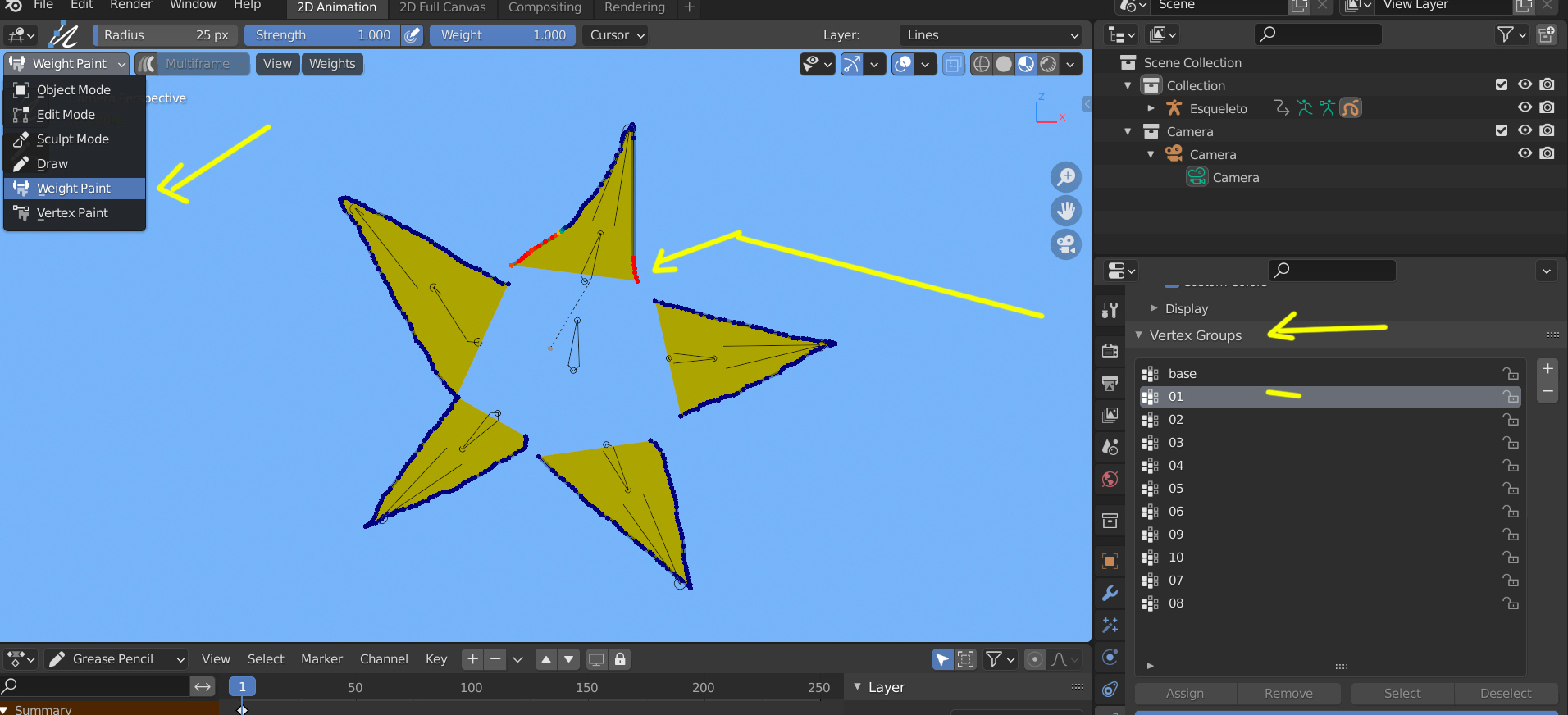 Hola, he creado un personaje en Grease Pencil y le he puesto los huesos, pero no entiendo porque razón cuando intento mover el hueso con una parte del personaje se mueven las líneas disparejas del relleno, aquí dejo una fotografía para que vean.