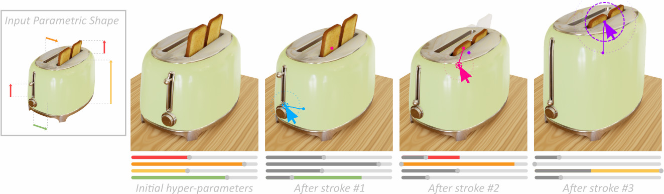 Editar modelos paramétricos directamente en la ventana utilizando un sistema basado en trazos de pincel. En los sistemas de modelado paramétrico tradicionales, los usuarios ajustan la forma de un modelo editando valores numéricos o arrastrando controles deslizantes de control para parámetros individuales. Esto cambia por completo con esta nueva herramienta que permite editar modelos 3D a través de pinceladas.