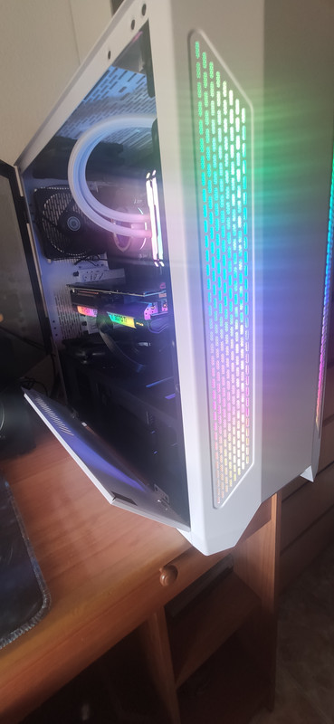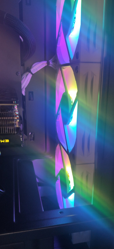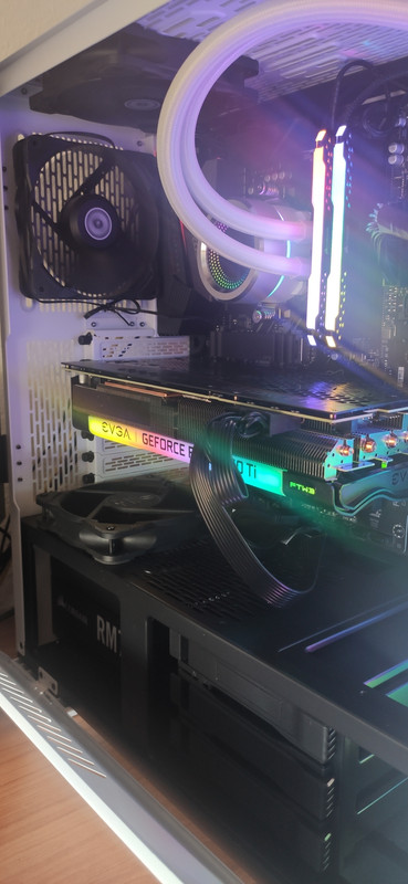 Tengo un radiador de 3 ventiladores Lian Li, 2 ventiladores sacando aire (uno atrás y otro arriba) y un ventilador inyectándole aire a la grafica.