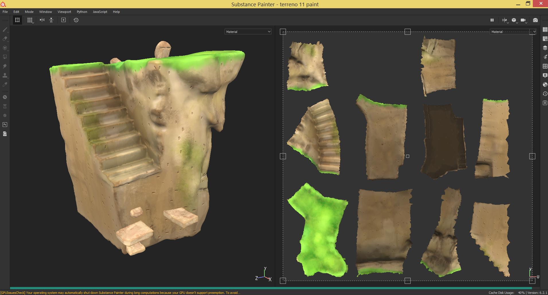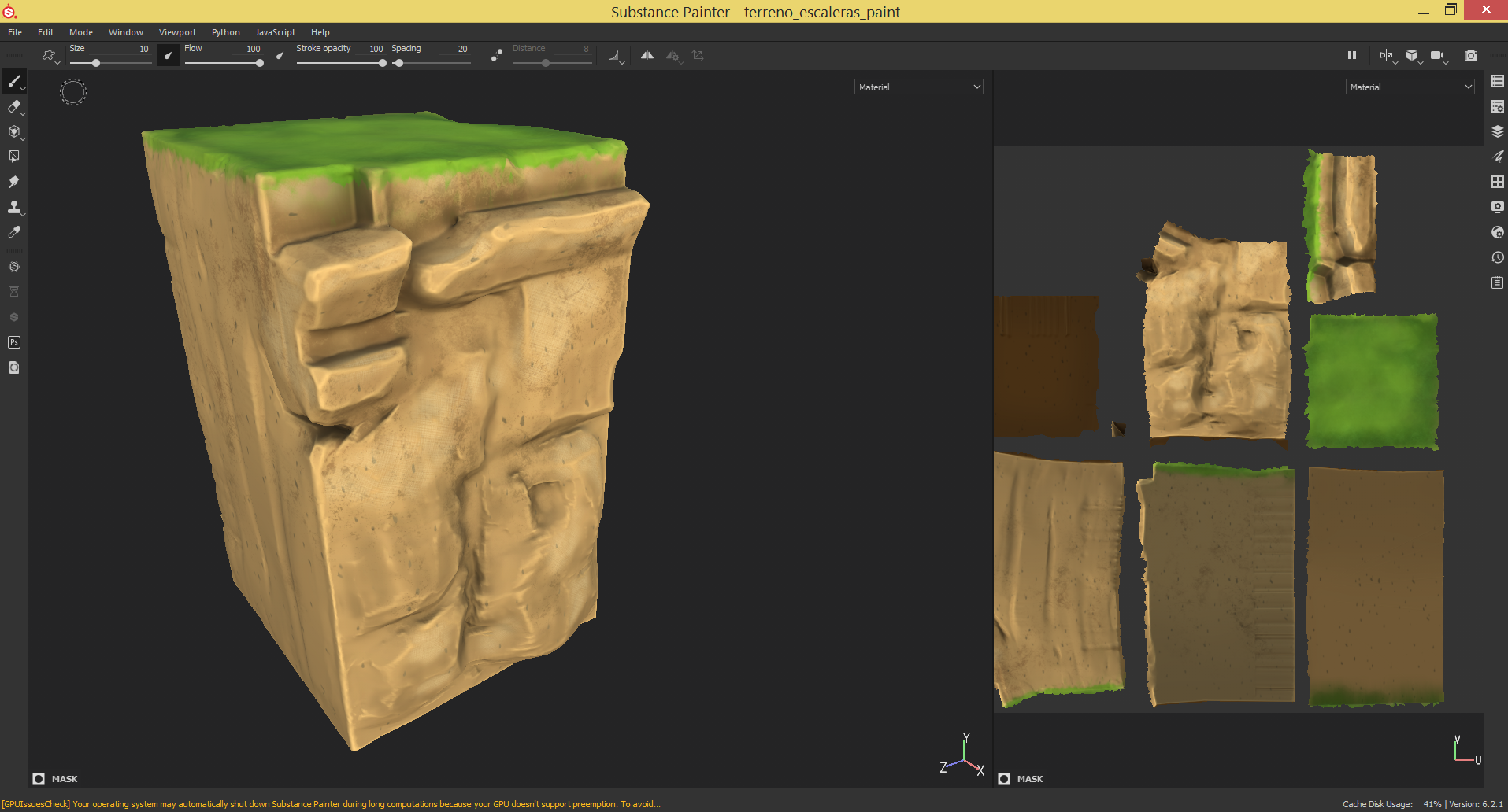 Adjunto capturas de algunos assets texturizados en Substance, donde puede verse que el proceso a sido conseguir una textura como si fueran pinceladas y todo el aspecto procurar que pareciera pintura 2d.