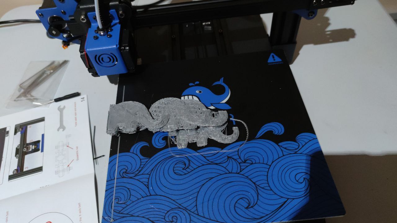 En mi primera impresión de un modelo de soporte para celular en forma de elefante descargado en tinkercad.com, mi impresora comenzó imprimiendo normal, pero cuando dejé que terminara se había movido de lugar la impresión. Estaba en busca de posibles causas ya que no he encontrado en la web el problema exacto, adjunto fotografía del resultado y el problema.