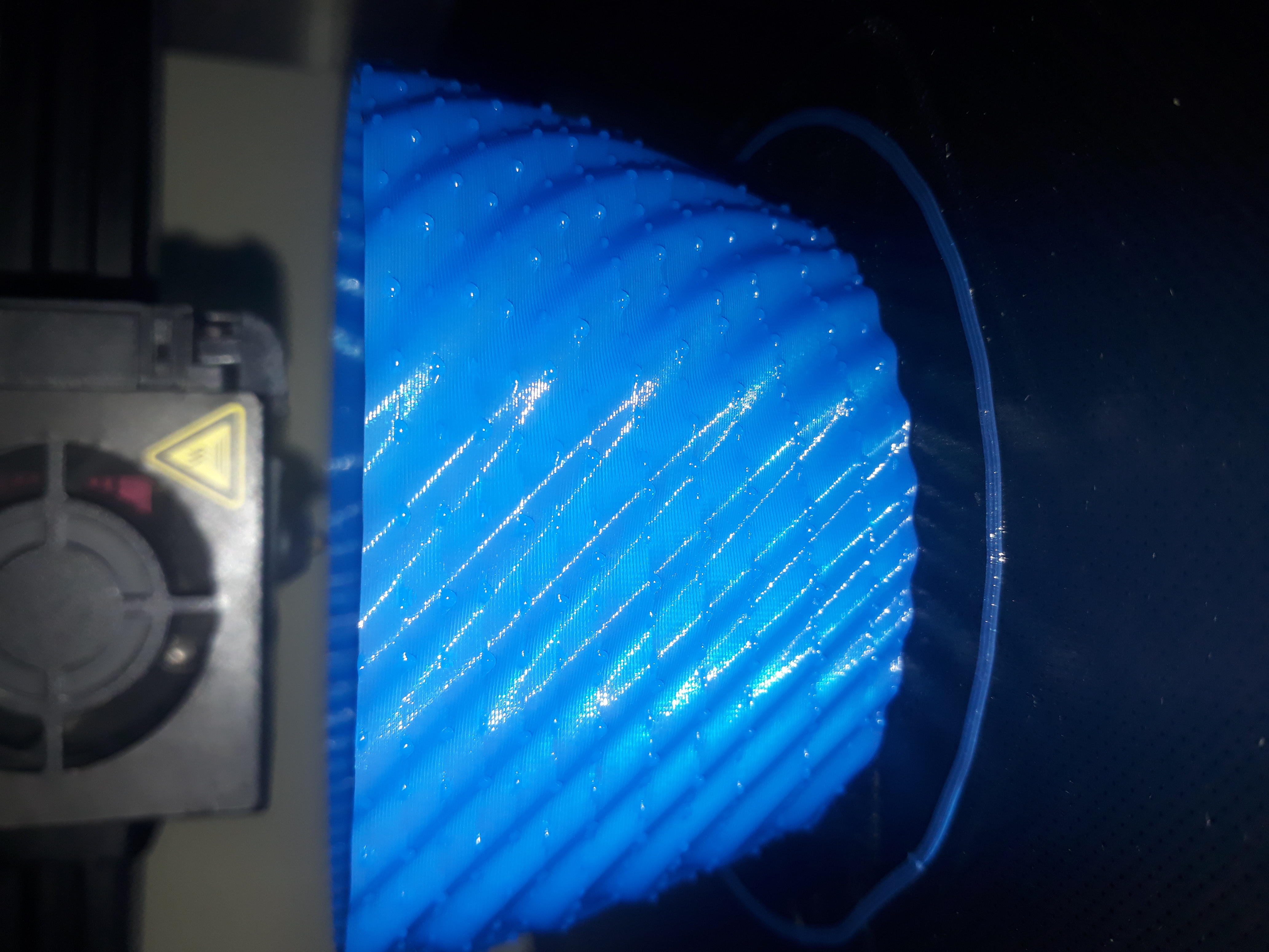 Como se puede observar deposita demasiado filamento cada x tiempo. Casualmente es cada vez que para el movimiento de los ejes por algún motivo. Esta función (espiralar/jarron) la uso relativamente seguido y solo me pasa esta falla con diseños como los siguientes: