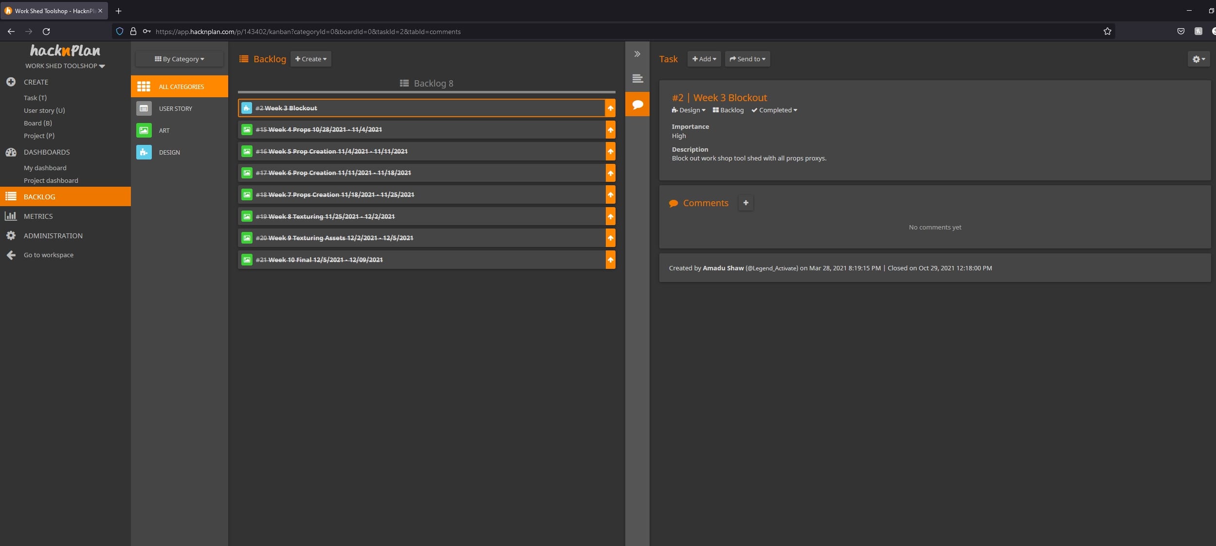 Utilicé una herramienta de planificación llamada HacknPlan que me permitió tener una buena gestión del tiempo; así como un buen flujo de trabajo. Lo usé para administrar la cantidad de accesorios que necesitaba crear y cuándo deben hacerse para mantenerse a un ritmo constante; y cómo tendría que texturizar mi escena.