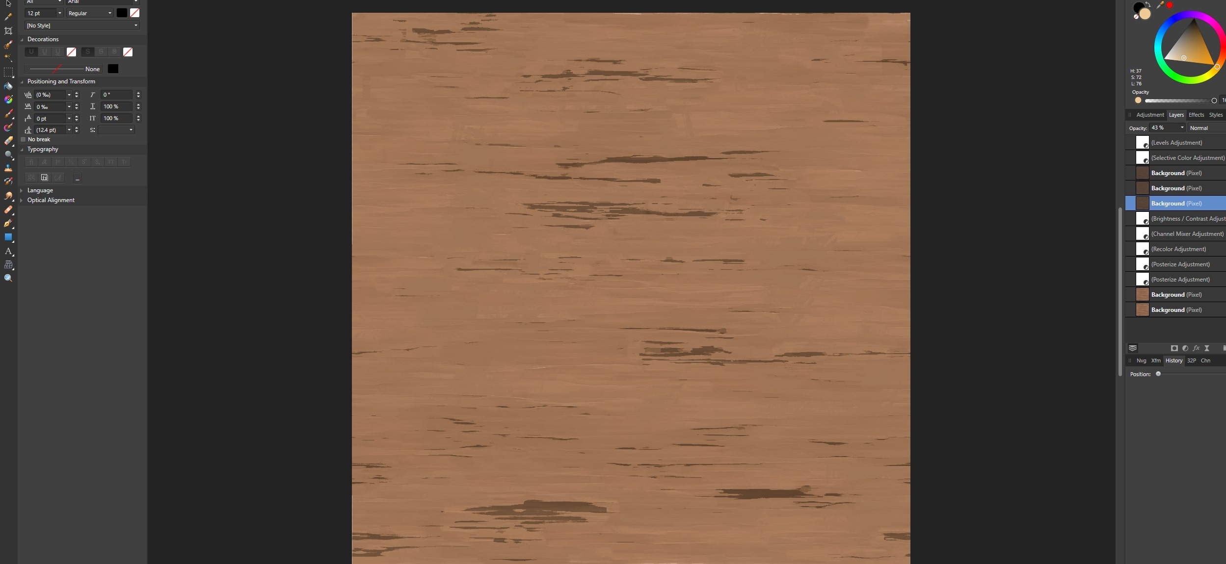 La textura ya tenía parámetros establecidos, por lo que era más fácil de manipular en Substance 3D Painter. Esta textura de madera es del artista M. Godoi de ArtStation. Cogí el material y lo manipulé hasta conseguir lo que quería que se viera. Llevé la textura a SP, exporté las texturas y la llevé a Affinity Photo para ajustar el color base de la textura.