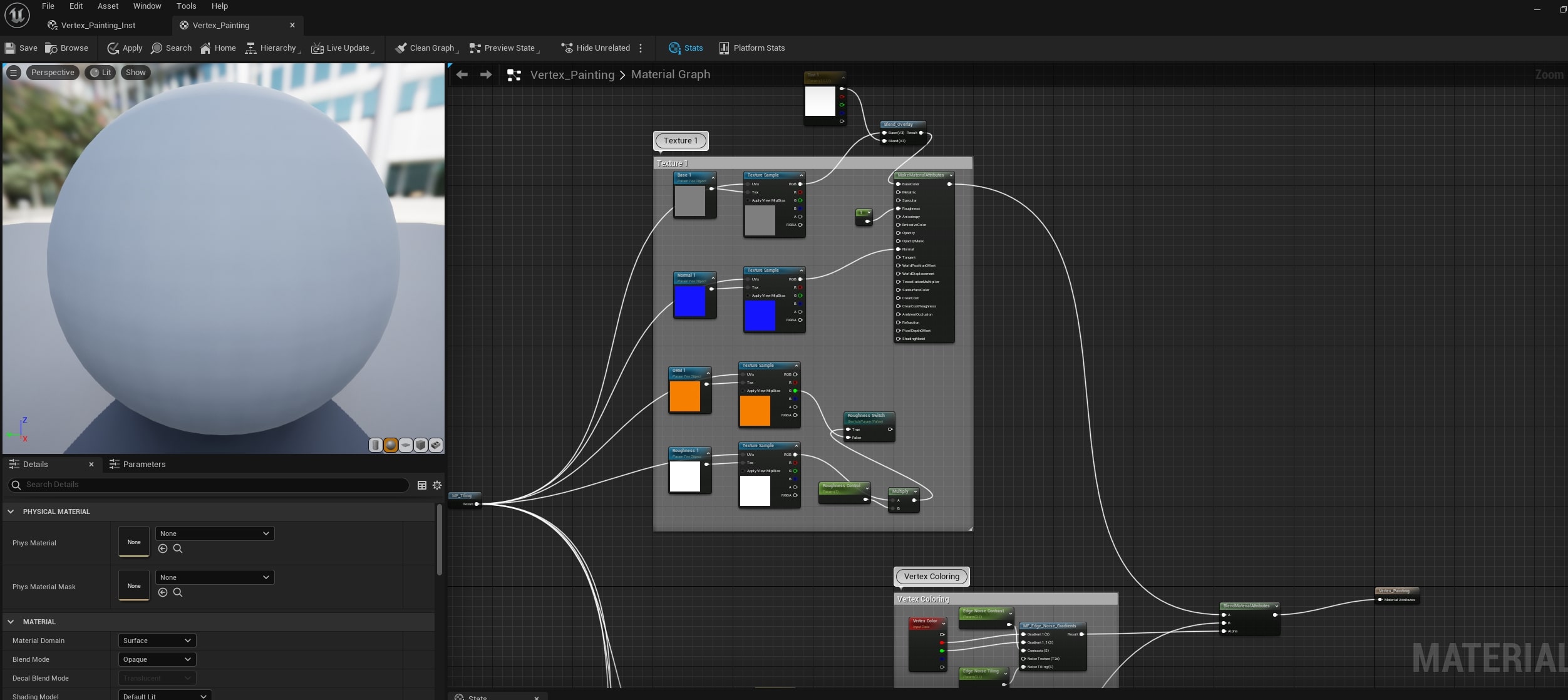 Para los materiales, hice un material simple que utilicé para que todos mis accesorios fueran económicos. Agregué configuraciones que me permitieron tener diferentes variaciones e intensidad de texturas y también Vertex Paint. Básicamente dupliqué el primer conjunto de texturas y lo agregué para poder pintar con vértices y, por supuesto, también le agregué configuraciones de mosaico y eso ya está en el motor por defecto.