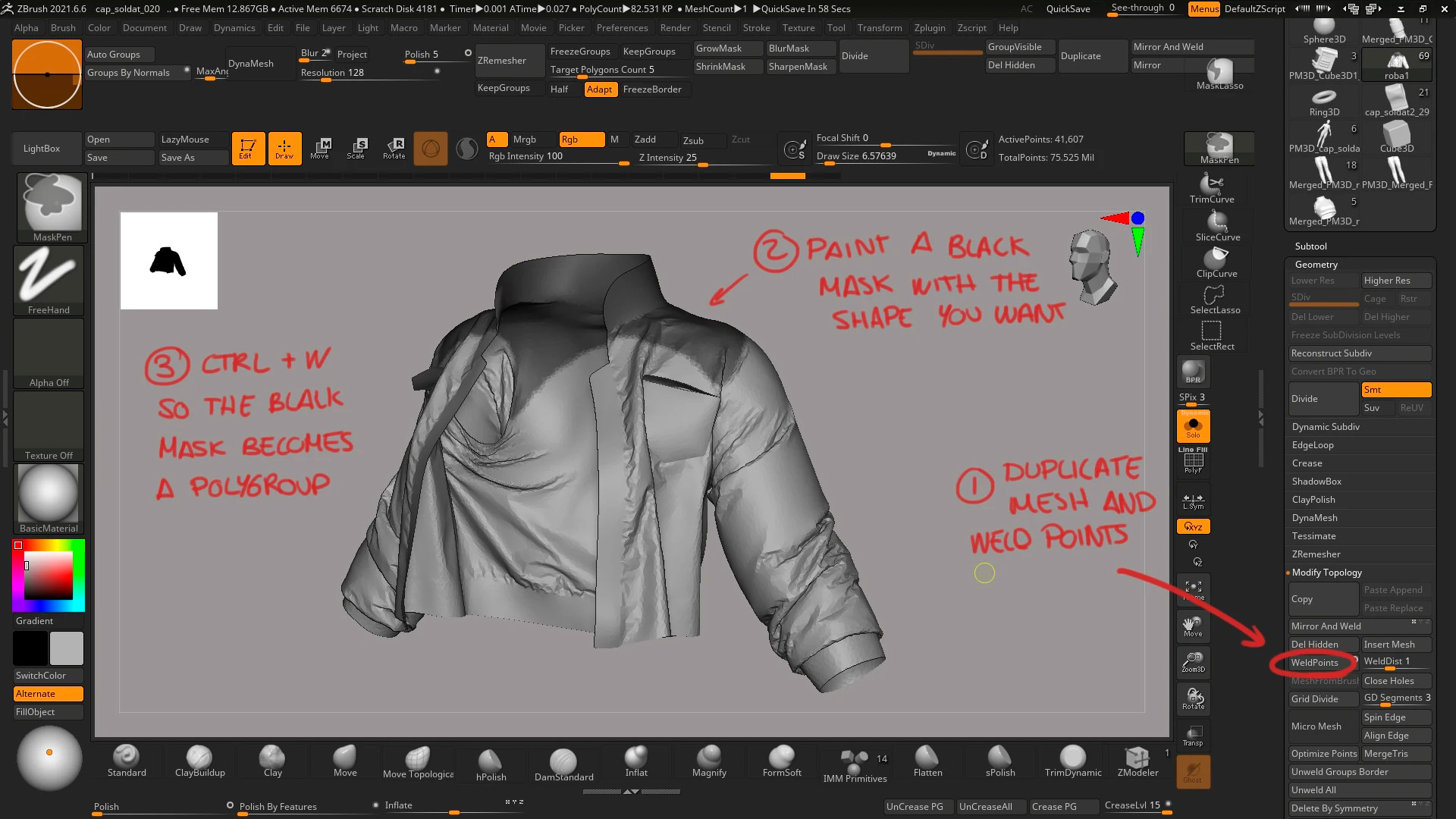 Para la chaqueta y el resto de la ropa, he utilizado Marvelous Designer. Tomé las referencias a los patrones de costura en Google. Luego solo tuve que experimentar con lo que ya tenía: mover líneas, puntos, cambiar curvas o agregarlas hasta que, finalmente, obtuve un resultado con el que estaba satisfecho. Para conseguir una mejor calidad, refiné la ropa en ZBrush.