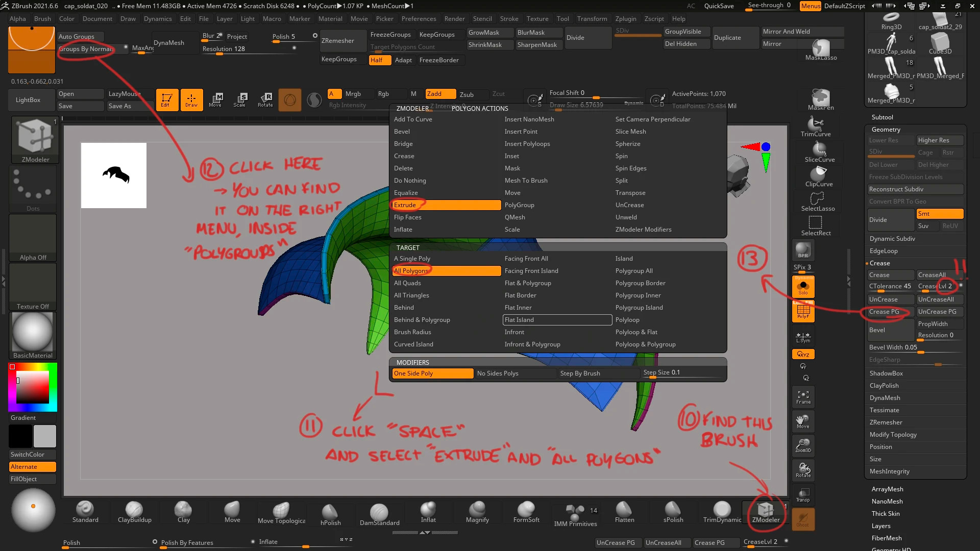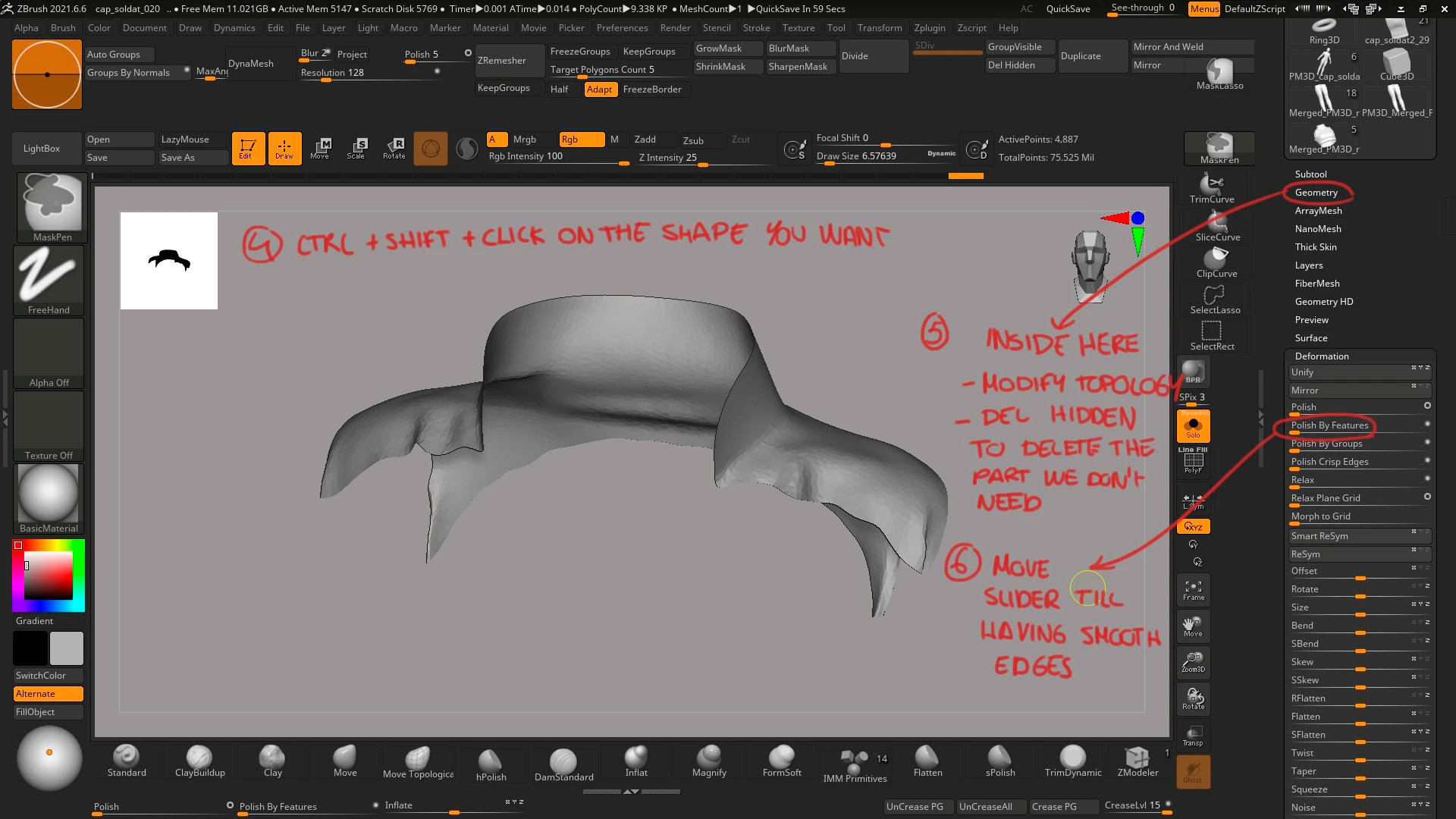 Para el calzado, busqué algunas imágenes de botas en diferentes ángulos y las puse en PureRef. Usando opacidad en PureRef y bloqueo de cámara en ZBrush, comencé a esculpir la forma principal con las imágenes al frente. Una vez he terminado la forma principal, uso Full Opacity y On the Side en PureRef, y empiezo a agregar detalles. Para la suela, he utilizado la técnica que he explicado antes. Los cordones se hacen con el pincel Curve, se duplican varias veces y se ajustan.