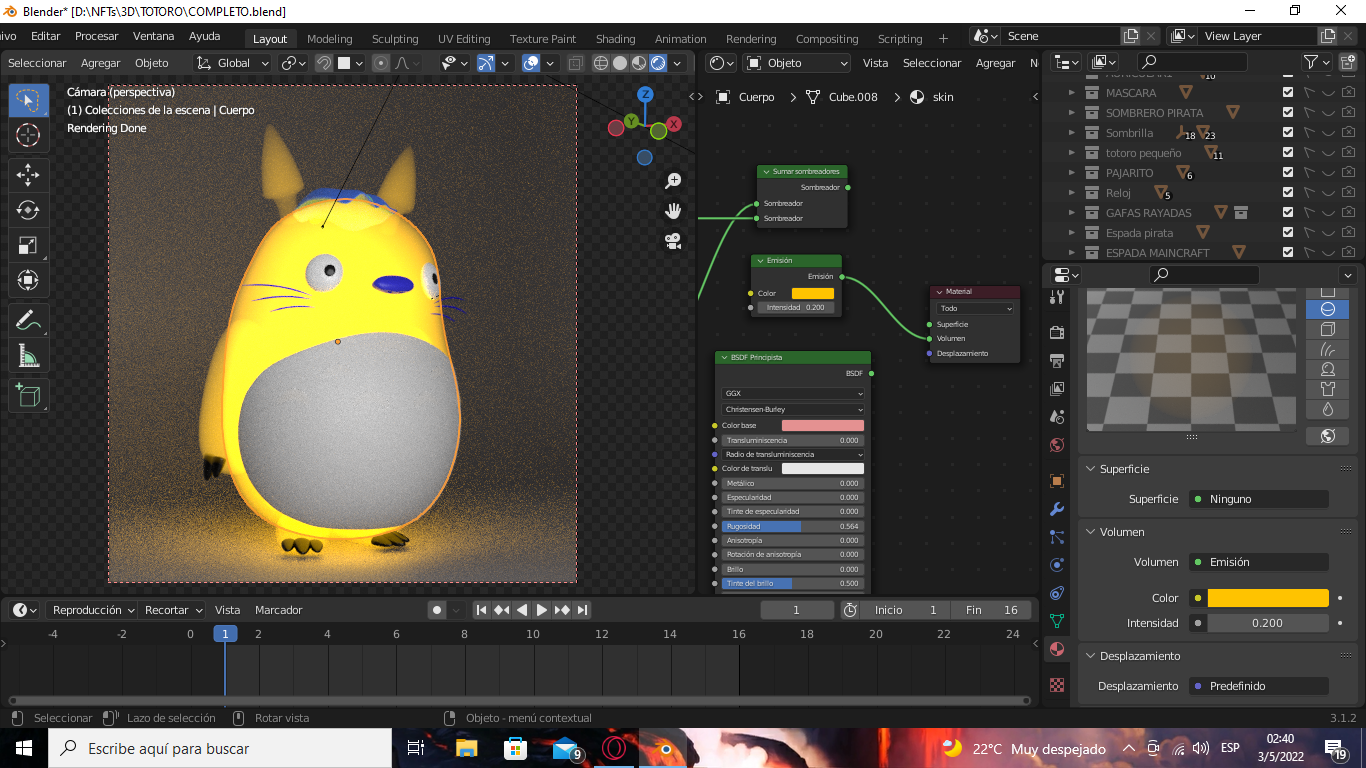 Hola, tengo una duda. Hice un modelo de un personaje animado, el cuerpo necesita que emita luz. He usado el nodo de emisión y cuando conecto Emision con superficie no me gusta el resultado.