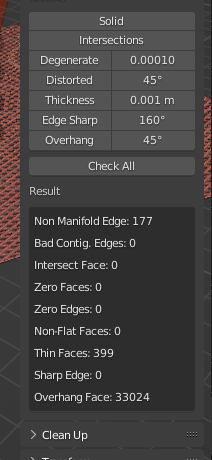 De una parte, he cerrado el contorno del tramex, una vez aplicado el modificador, pero cuando chequeo la malla con 3d print tool, me lanza un mensaje de que hay manifolds edge, (he hecho un merge by distance en modo edit anteriormente).