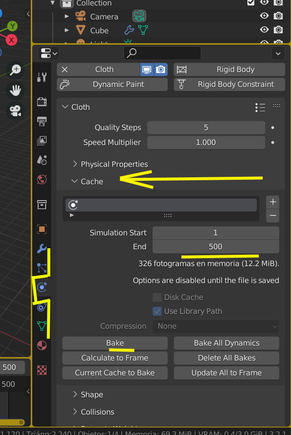 Estoy haciendo una animación de ropa pero la animación se me congela en el frame 250 y en el apartado de scene tengo el cache de ''entorno de cuerpos rígidos'' hasta el 570.