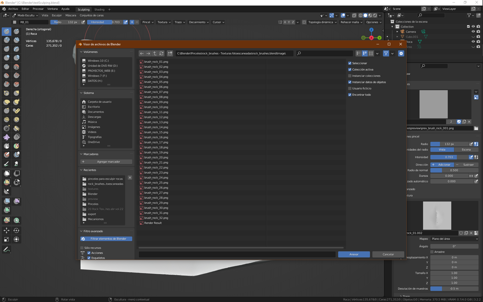 Desde "Anexar" un archivo rock_brushes.blend sin problemas. Después he seleccionado varias brochas y he esculpido con ellas y van bien, pero con el Dyntopo activado e incluso con un valor de 500, no genera nueva geometría, como con las brochas por defecto, aunque realmente le haga falta, pero ni un polígono de más.