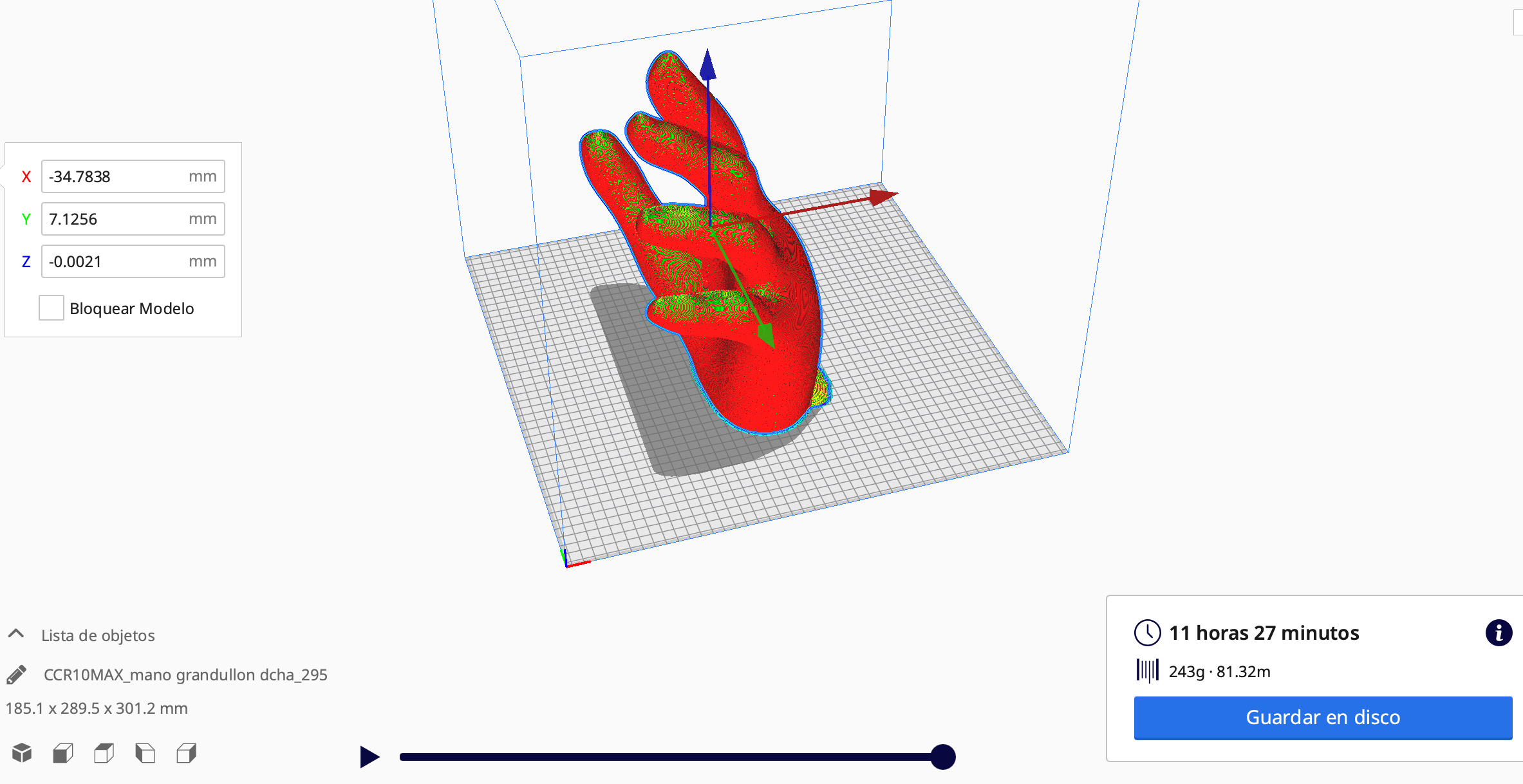 No lo consigo en cura, he seguido tutoriales y cambiado parámetros para la boquilla 0,8 pero me marca una impresión de casi 18 horas, y eso quitándole hasta el relleno, no es posible esos tiempos para una simple mano de 29,5 centímetros.