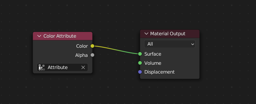 - Cuando no hay canal Alpha, no hay problema: del panelito "Color atrtibute" conecto "Color" directamente con el nodo "Surface" de "Material output", punteando al panel "Principled BSDF".