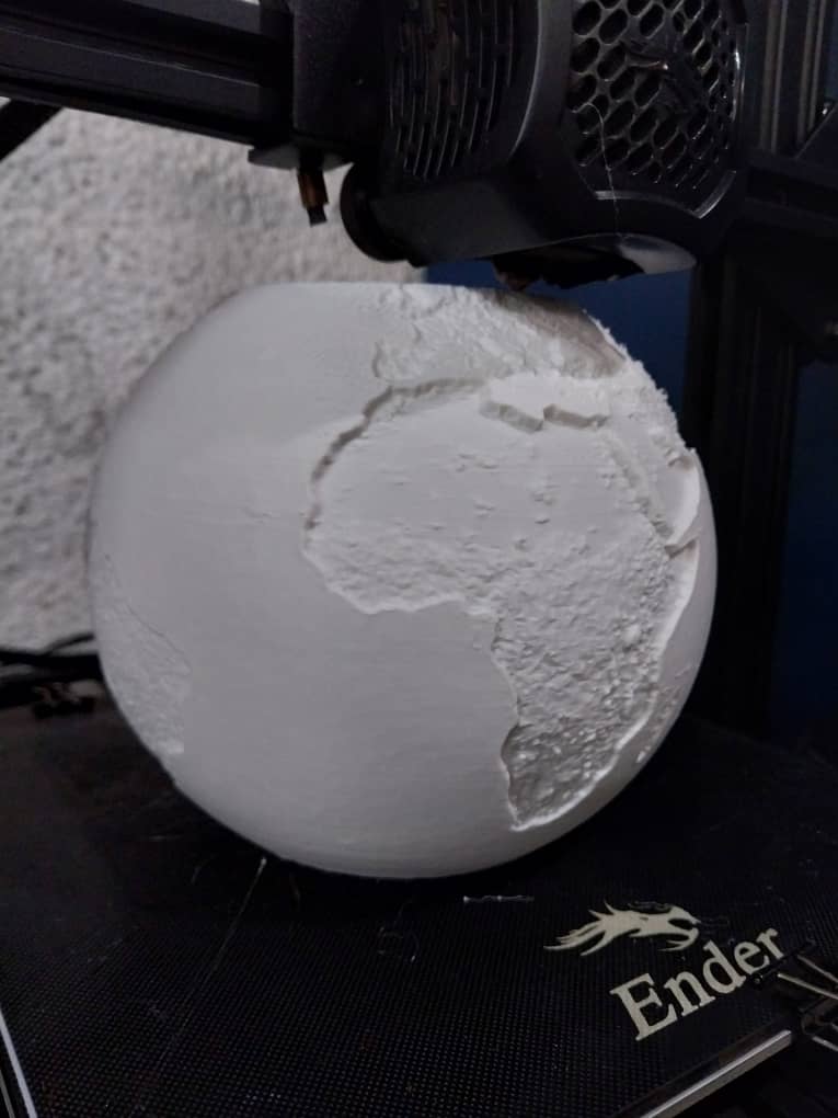 Hola, tengo una ENDER 3 V2. Para ponerlo en contexto, estoy imprimiendo un modelo de la Tierra. Este STL tenía una cantidad de polígonos muy alta, con 1.340.000 triángulos. Lo cargué en el laminador CURA con el perfil que siempre utilizo y que no me da ningún problema. La impresión debe durar 18 horas.