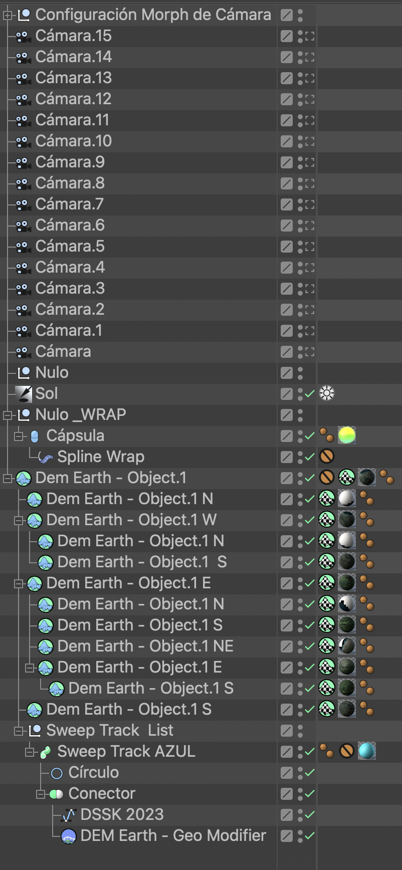 Hola. Ante todo, gracias por responder a mi consulta. El offset del Spline Wrap lo he utilizado, como mencionaste, para desplazar y animar el wrap a lo largo del spline, pero no me permite elevarlo. El Spline Wrap está ubicado en el árbol fuera del objeto Dem_Object, aunque utiliza la curva GPX ("DSSK 2023") del Dem_Object como spline.