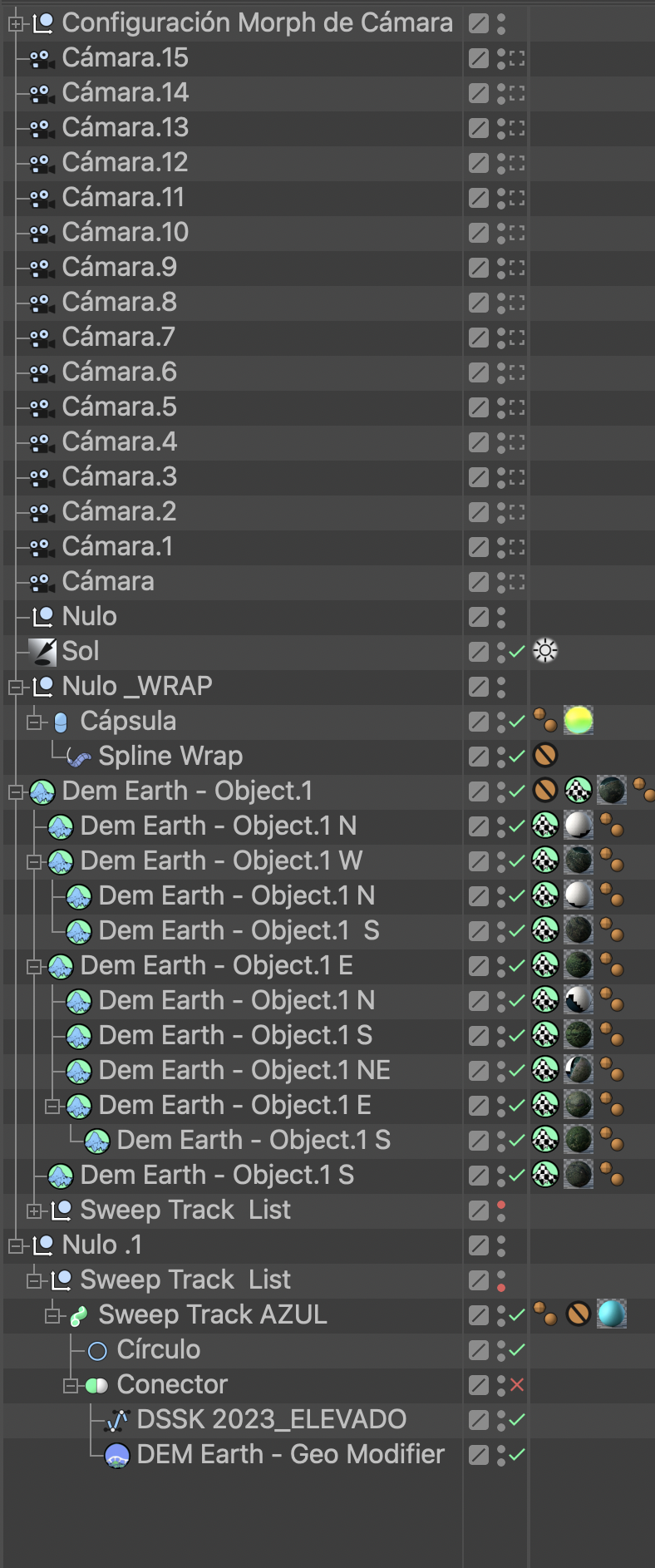 Hola de nuevo. Al final lo he logrado. He duplicado el grupo del Dem_Object, eliminando todo excepto el grupo de la curva GPX ("Sweep Track List"), y luego lo he colocado dentro del nulo. Después, he sacado el nulo fuera de la copia del Dem_Object y he eliminado este último. Ahora, la nueva copia de Curva (DSSK_ELEVADO), que se utiliza con el Spline Wrap, permanece correctamente posicionada sobre el mapa y he logrado elevarla.