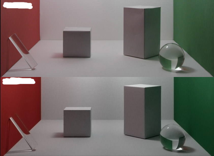 Como ejemplo, la imagen a la izquierda está hecha con GPU y tardó más de 33 minutos, y no sirve para animación, pues titila en la calidad de GI para poder reducir el tiempo a 33 minutos. Es decir, para que sirva para animación debería tardarse unas tres horas como mínimo. A la derecha está la misma escena sin tocarle nada, hecha con GPU a la extremísima cantidad de 2400 samples y tardó 48 segundos.