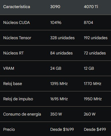 Sin embargo, la 4070 Ti es una tarjeta gráfica más reciente y tiene un rendimiento general más rápido que la 3090. También tiene un consumo de energía más bajo, lo que puede ser importante si está utilizando una computadora portátil o un sistema con una fuente de alimentación limitada.