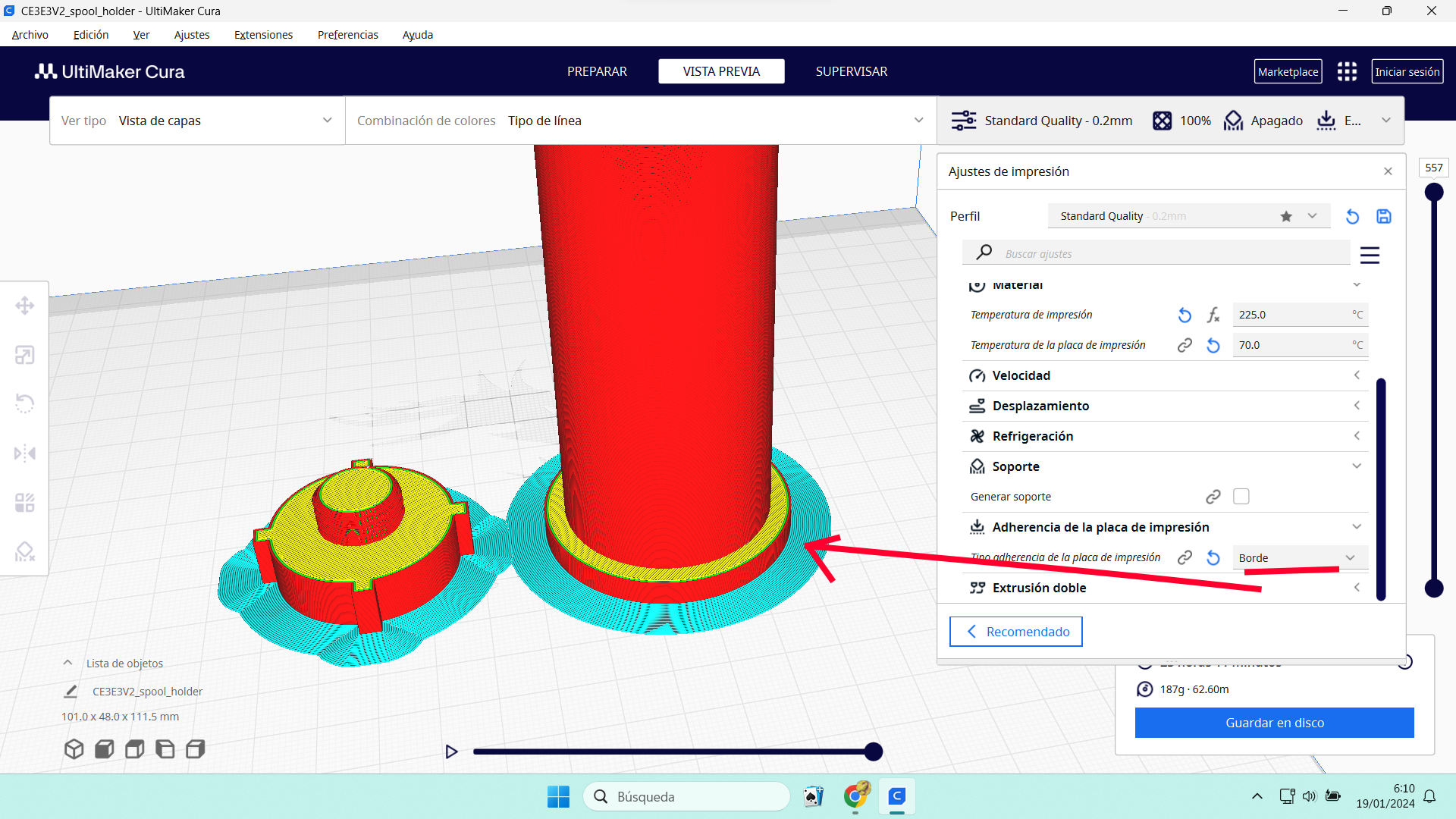 De todas formas, para asegurarse de que algunas piezas con apoyo muy pequeño tengan una buena adherencia a la cama, se recomienda aplicar "Adherencia a la cama" con la opción de BORDE, así tendrán más base de apoyo.