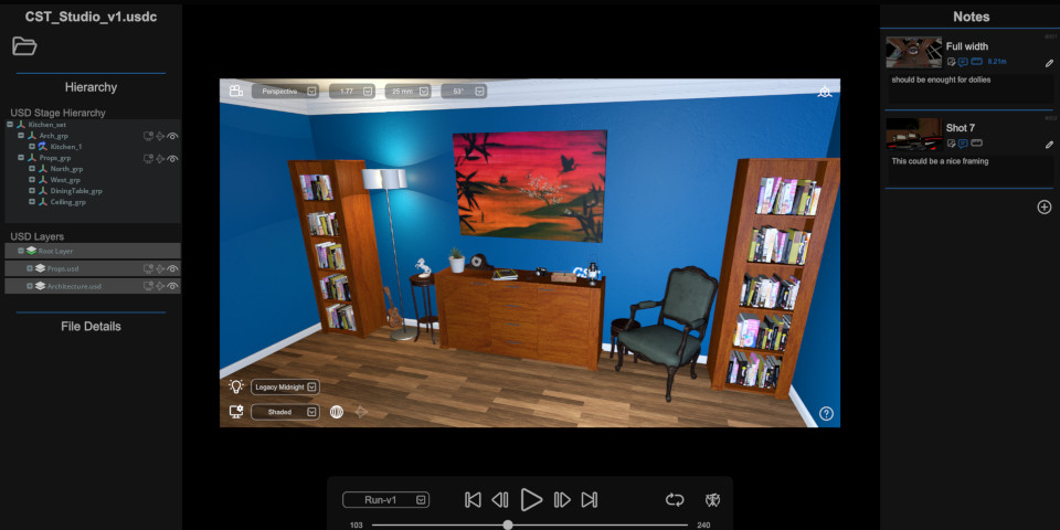 En su versión beta actual, el visor se enfoca en mostrar y navegar escenas USD, con una calidad de renderizado comparable a UsdView. Sin embargo, el objetivo es convertirlo en una herramienta profesional con funciones como ajustar iluminación, sombreado y cámaras, además de inspeccionar datos de la escena y jerarquías de objetos.