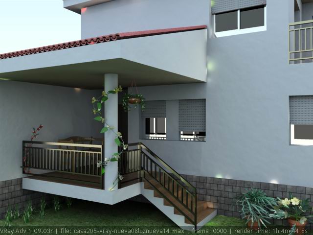 Mi humilde crítica. Trata de arreglar las tejas que parece que no estuvieran traslapadas verticalmente (es como si se superponen sólo en sentido horizontal), las plantas me parece que son de colores planos, se ven muy poco naturales, para el césped yo usaría un mapa de desplazamiento (se ve muy plano), el cambio de material de madera a blanco (el piso y escalera) se ve raro, el material del pasamanos es muy reflectivo, quizás con algo de Glossy quede mejor, la iluminación está bien, quizás sube un poco el radio de los fotones para lograr un mapa más suave en zonas conflictivas sin tener que subdividir más las luces. Saludos.