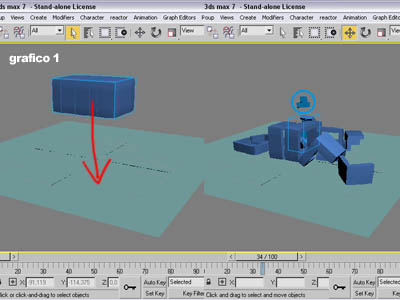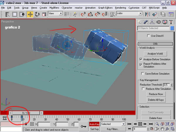 Para ello ánimo la piedra en unas cuantas keyframes. (ver gráfico 2) y en teoría y según los tutoriales, el Reactor me crea la animación.