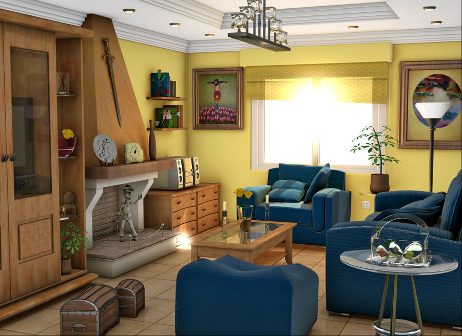 La imagen en general me gusta, pero veo un par de cosas: Hay algunas texturas muy planas, como los ladrillos de la chimenea y el mueble del equipo de música.