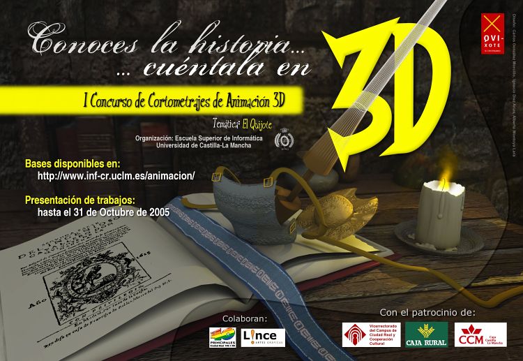 Hola a todos. Bueno, no sé si esta es la mejor sección del foro donde publicar este hilo, pero, allá va. La escuela superior de informática de la universidad de Castilla-la mancha organiza el primer concurso de animación 3d por computador, que este año versara sobre la obra de Cervantes el ingenioso hidalgo don quijote de la mancha.