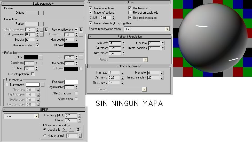 Además, intenta quitarle la opción de Fresnel relfexions para que salga correctamente, (debe salir el fondo de colores dentro del material).