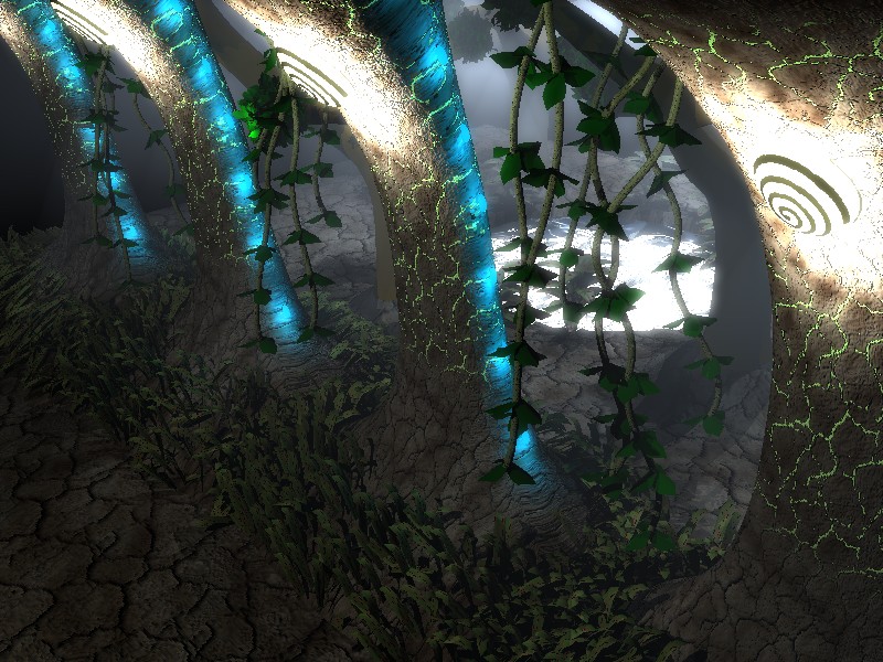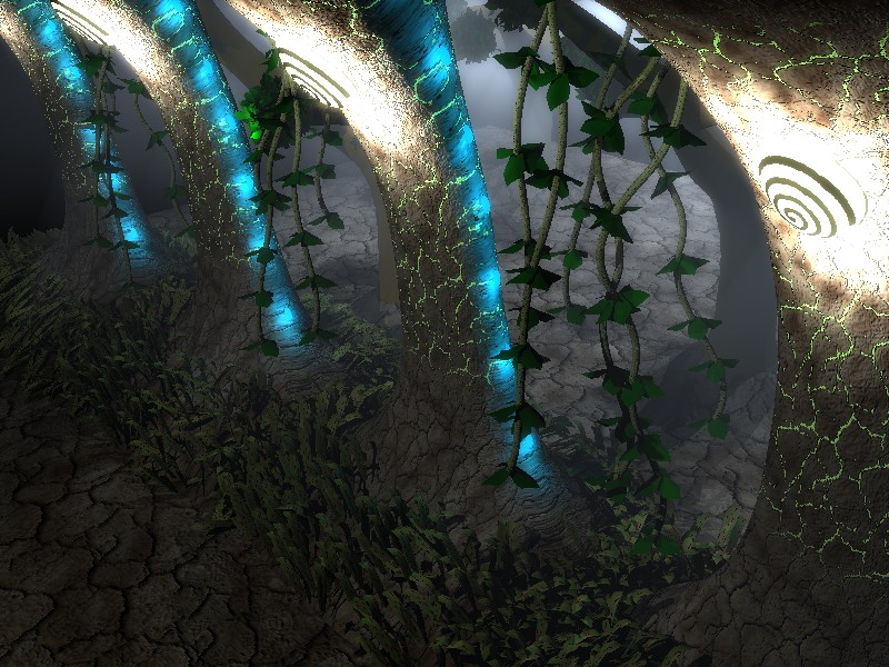 Ideas para el futuro: montón de plantas, arbustos, flores extravagantes, hierba, luciérnagas, plantas de agua con hojas exóticas, hiedra, lianas, luciérnagas gordas (insectos no terrestres) agua encharcada en el suelo, textura más saludable en el suelo, algo de ruido para simular montículos. ¿una madriguera quizá? Puertas bio-mecánicas.