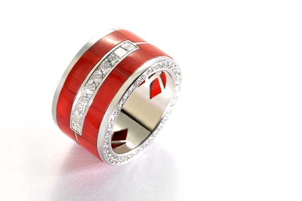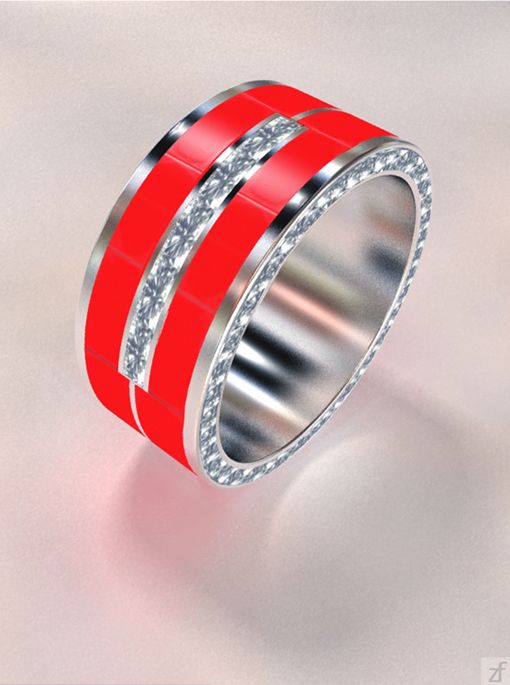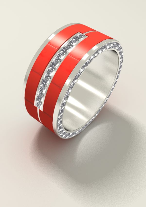 La zona de coral rojo podría mejorarse mucho con un difuso personalizado. Incluso el escaso borde que sobresale debería tener un color más oscuro. En cuanto a los diamantes, supongo que, modelar y utilizar materiales RayTrace o similares puede dar bastante trabajo. Pero lo que es una opción es modelar mínimamente partiendo de la textura que ya tenéis antes de aplicarla como difusa, sobre todo los del centro, que, por su tamaño cantan bastante, si os fijáis en la fotografía real, da la sensación de que los diamantes centrales son un prisma rectangular con los borden biselados, o que incluso, el diamante se encuentra por debajo de este prisma transparente, quizás, si modeléis estas sencillas formas dejando la textura difusa por debajo, podríais conseguir ya la sensación de volumen, los brillos más intensos de los diamantes podrían no ir incluidos en la textura, añadiendo luego en mensaje con el Adobe Photoshop, en cuanto al material cromado, si estáis utilizando un motor de render, yo probaría añadirle un pequeño glossiness o bien un noise muy pequeño en el canal bump, también intentaría controlar el brillo especular sobre el coral rojo, ya sea mediante un material anisotrópico o por una máscara en el canal especular, usad un ligero dof, y quizás cambiad un poco las proporciones, ya que ese anillo en la realidad sería muy delgado, bueno, son muchas cosas, quizás alguna os sirva. Saludos de Drakken rotor.