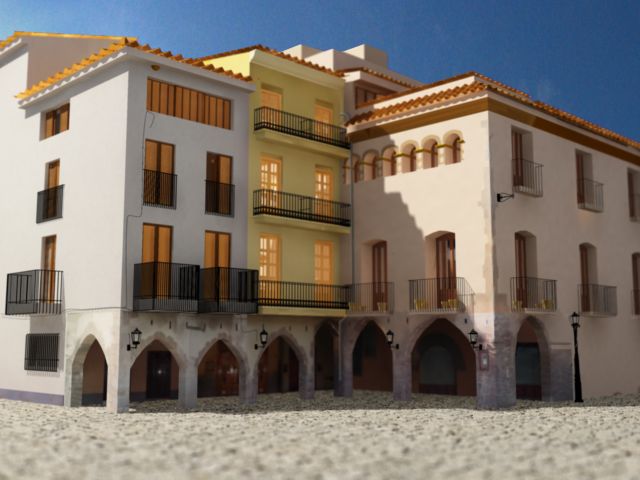 Lo de los barrotes de la barandilla es así, de hecho, los conté de la fotografía que hice y lo copié, hay el mismo número de barrotes y la anchura es la misma también, voy a poner una farola en la derecha que quedaba vacío y a tapar el ángulo de incidencia de la luz solar con cajas (edificios) como en la realidad están.