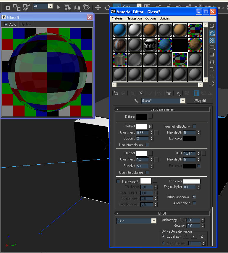 Hace un Vray (*.mat) con estos parámetros y voila. Sino sale, hace una imagen con vidrios y una sin y después las superpones en highlight en Adobe Photoshop.