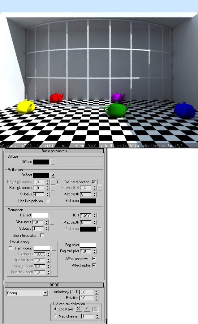 Liberado, si has hecho pruebas, ¿te importaría poner las imágenes? Te lo agradecería un montón. Supongo que si le das una fuerte reflexión a un objeto, tendera a espejarse, ¿cierto? Creo que sería una buena actividad para los que usamos Vray: dada una fotografía, intentar conseguir un vidrio similar para un modelo también común.