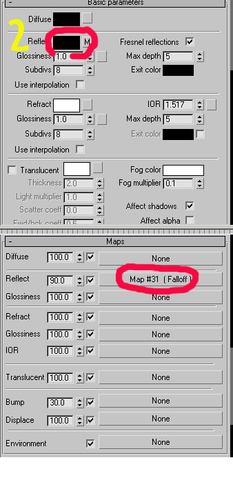 El color blanco es = a reflexión máxima, el color negro es = a reflexión nula, dentro de las propiedes del mapa fallof, tienes varias opciones, por defecto sale: perpendicular/paralell esto lo que hace es que, alinea el color blanco con respecto a la vista de modo que todo lo que esté perpendicular o paralelo a la vista (cámara) tenga la máxima reflexión, y todo lo demás, tenga la mínina o menos reflexión, si te fijas en la vida real, en cualquier edificio, veras que hay cristales que reflejan tanto que no se ve a través de ellos, sin embargo, otros cristales igual de limpios, dejan ver a través de ellos, de hay que el fallof sea útil para simular ese efecto, por lo tanto aconsejable en muchas ocasiones para cristales arquitecturales, en tu caso, puede que no te convenga, puede que sea mejor que dejes el canal reflection sin mapa, pero con un color blanco total para que refleje al máximo en todas posiciones, yo te aconsejaría que te trabajaras el entorno (que al fin y al cabo, es lo que van a reflejar los cristales) puedes trabajarte unas cortinas (o algún tipo de lama) para ponerlas detrás de los cristales o incluso puertas, yo que sé, dale un poco a la imaginación, la escena es muy simple, métele detalles y ayúdate de ellos para solucionar problemas como el de los reflejos y el hecho que detrás de las cristales no tengas modelado nada, también puedes intentar integrar el edificio con una fotografía tirada de frente a los cristales, crea un plano (plane) y sitúale frente a los cristales de marras, aplica a este la fotografía como textura (en el canal Diffuse metes la fotografía sacada con tu cámara, que no se vea el plano desde la cámara) pon una luz que solo afecte a este plano (excluye el resto de la escena en esa luz) y que no proyecte sombras, de esta manera el entorno real del edificio se verá reflejado en los cristales, hay otras formas de conseguir esto, por ejemplo, con un material estándar y poniendo en el canal reflection la textura que hemos conseguido con nuestra cámara digital de los edificios o lo que haya frente a tú edificio. Soluciones mil. Pero mi consejo es que empieces metiendo detalles, la escena es más simple que un chupete, posiblemente si no metes detalles no te acabara gustando nunca, no hay que correr, hay que trabajar y aprender de cada paso en una escena, el render final ya vendrá.