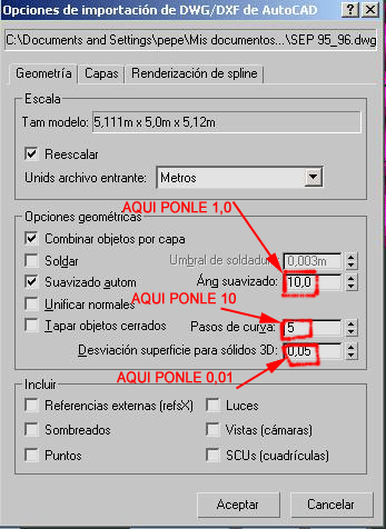 He probado a cambiar las opciones dentro de AutoCAD que me dijisteis, también el cuadro de diálogo de importación de max también le he puesto todos los valores posible, pero nada el jodido arco sigue pareciendo hecho a cachos no sale suavizado en el 3ds Max.