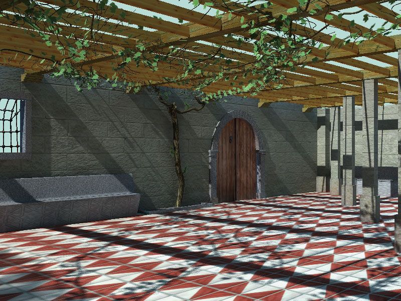 Está chulo el patio, pero además de lo que dice Drakken, y a mí modo de ver, que no tiene por qué coincidir con el tuyo, buscaría una textura para el banco de piedra, así como para el arco de la puerta un poco más complementarios con la del muro. Por otro lado, en la pérgola de madera, sobre todo en la viga que hay en primer plano, se aprecia una luz muy larga, (aproximadamente 6 m, porque no veo el pilar). Bien es verdad que no es mucho el peso que tiene que aguantar, pero si las viguetas de madera las empotras en ella de la forma que se aprecia, seguro que parte. Yo las apoyará directamente sobre la viga o cómo mucho a media madera, me gusta mucho ese tipo de puertas rústicas como la que utilizas, pero me da la sensación de que está al revés, o sea que esa es la parte que se debería ver por fuera. Para el interior del patio yo utilizaría esa misma puerta, pero viéndose la estructura de madera donde van clavadas las tablas de la puerta que ahora vemos. La reja la veo un poco al ajillo, no sé si será el antialiasing. Saludos. Mery.