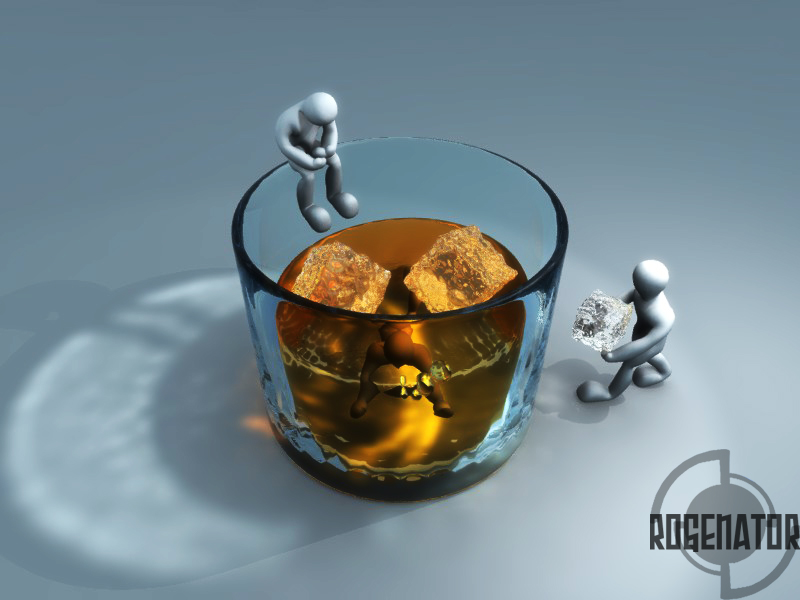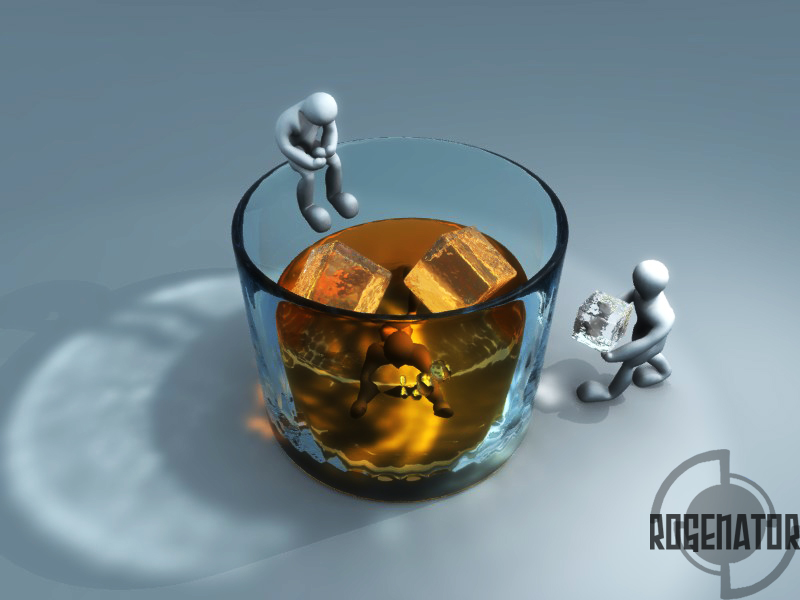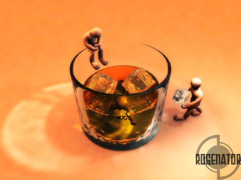 Los personajes, sencillos, pero efectivos. Creo que los cubitos estaban mejor antes, sin tantos bultos. Estaban más acorde con el estilo general de la imagen. Aunque para gustos, los colores, sólo un detalle físico: la densidad del líquido que hay en el vaso debe ser muy alta (en comparación con la de los cubitos), ya que estos prácticamente no están sumergidos en el líquido (si es que lo están, porque no se aprecia muy bien). Si sumerges los cubitos más en el líquido, quedará una imagen más verosímil. Llena un vaso con agua y echa un cubito de hielo para ver mejor lo que quiero decir, pero vamos, que me ha gustado bastante. Una cosa más, pon un wire. Saludos.