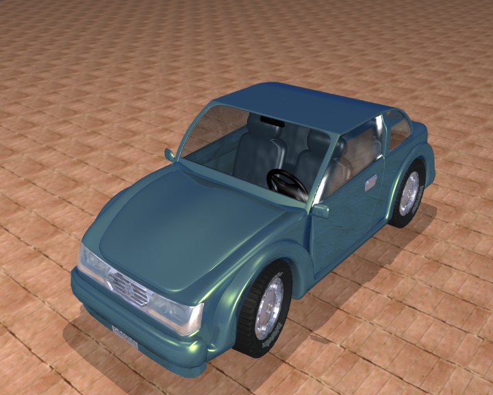 Empecé a estirar una caja en Blender que fue tomando forma de auto :-o y bueno a seguir acabando el modelo. La primera imagen esta renderizada con el motor interno de Blender y la segunda con Yafray e iluminación HDRI. Ambos en Blender 2.4 alpha 2.