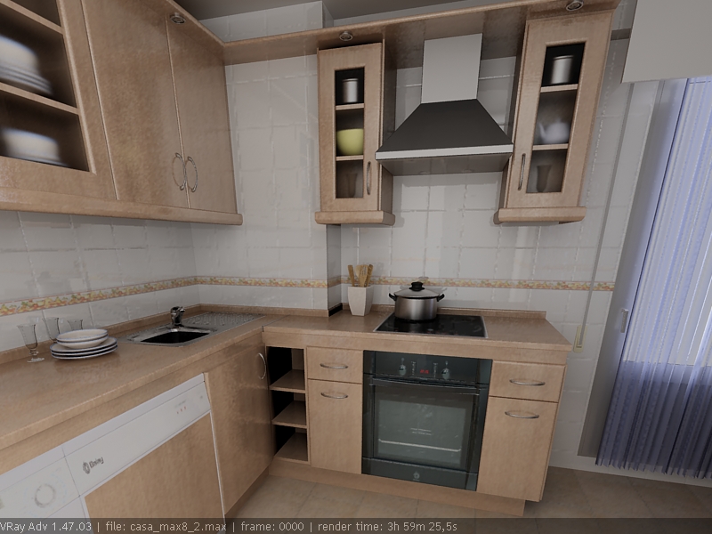 Hola Lole, me agrada tu trabajo de la cocina, sólo criticaría la distorsión que genera la lente de la cámara, es muy forzada para ese tipo de imagen, la dejaría normal. Por el resto, desde mapeado, texturizado, modelado e iluminación me parecen super bien, quería preguntarte. Cómo hiciste para que el vidrio distorsionara o difuminara las piezas que se encuentran dentro de los gabinetes? Me parecen excelente ese efecto de vidrio esmerilado (no sé si era lo que estabas buscando) pero quedó bien fino.