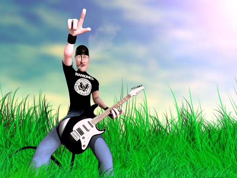 Bueno, a mi parecer no pega ni con cola el fondo que has puesto con el personaje, al mismo tiempo se ve un borde negro alrededor de todo el personaje que queda feo, intenta suavizar esa integración, coincido en lo de que los dedos quedan raros tanto que sean 4 como que no tengan uñas, en general el personaje es tirando a realista y las manos son demasiado cartoon, muy tipo Mickey mouse, amos, que no pega, el tipo carece de expresión, tiene la cara como congelada, la postura indica que esta como disfrutando del momento, y la cara no la acompaña, yo intentaría abrirle la boca como gritando, y fruncirle el ce¿o o algo, pero que tenga alguna expresión facial, la postura que le has puesto no está mal, se puede mejorar mucho, pero de momento te diría que lo pongas más recto ya que pierde el equilobrio, se cae hacia atrás, o esa es la sensación que d? Y el cable que sale de la guitarra es gordo como el solo, parece un tubo más que un cable.
