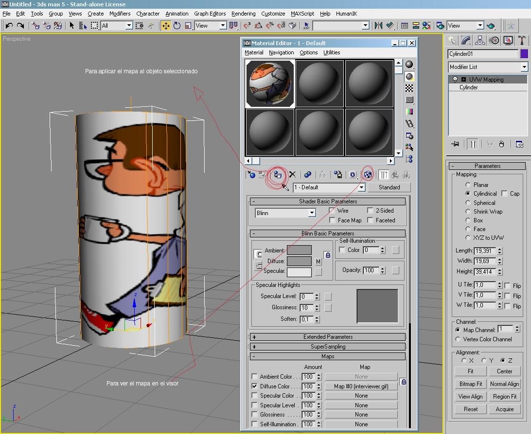 Si estas usando max, lo que debes de hacer es seleccionar un modificador UVW map, y elegir la aplicación cilíndrica del mapa, ya que tú máquina tiene esa forma. Luego, en el editor de materiales, abajo, en maps, en el canal diffuse, eliges un bitmap, buscas el que tengas para la máquina y aceptas, ahora, para enlazar todo esto, mira está bonita captura cortesía del tío IkerClon.