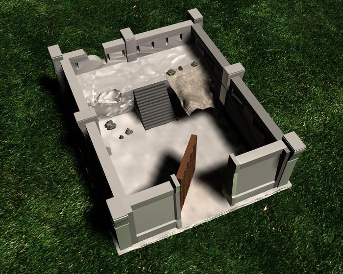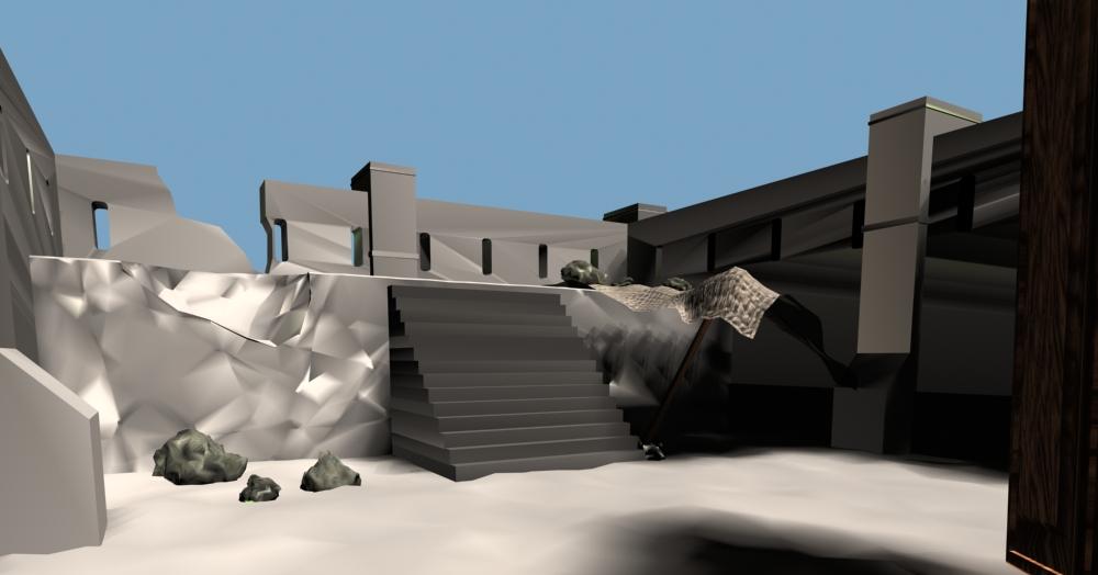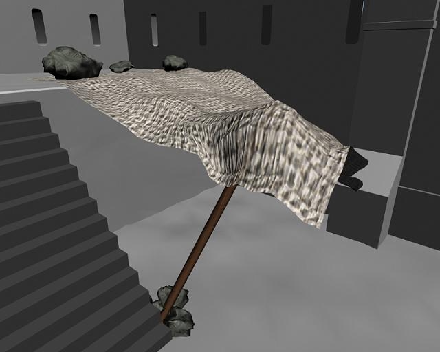 Para los muros cree las ventanas con booleanas y al hacer eso me dejo esas tiras transversales que luego me fastidian la lisura de la pared. Luego esta la refracción del césped de fuera sobre los muros, he quitado la refracción en la textura, pero como si nada. Algo que me trae de cabeza es ese intento de parasol en la esquina, una tela que se sujeta por unas piedras en el muro y por un palo en el suelo. Lo hice con Spline, pero quedo como quedo, y me ha pasado un par de veces intentando hacer cortinas, es posible anclar determinados vértices de un plano y luego aplicarle un modificador Cloth o algo similar?