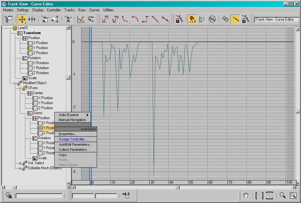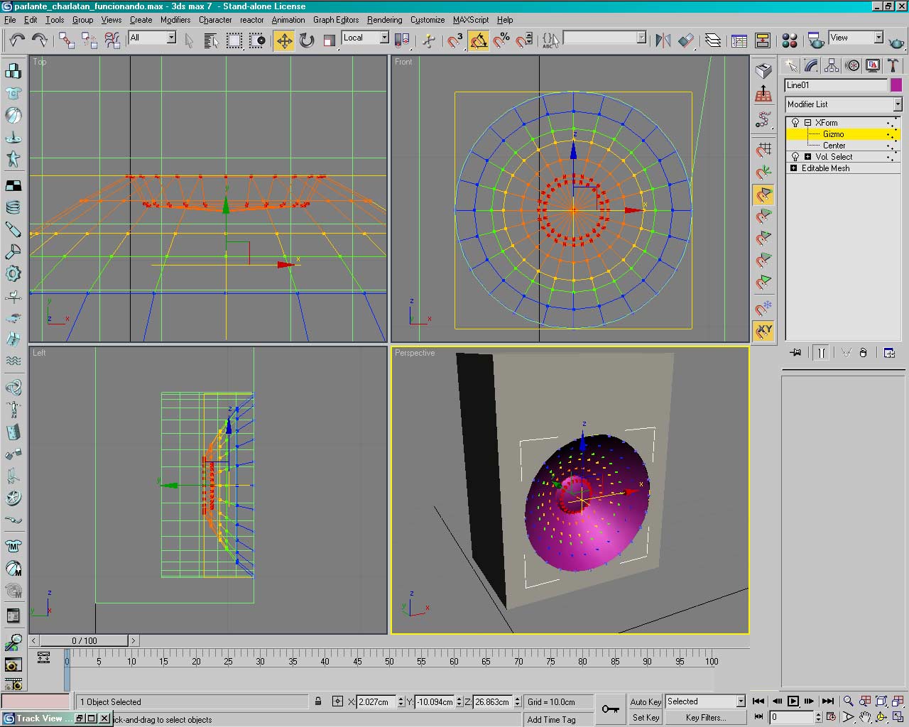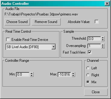 Una vez que has aplicado el XForm abres una ventana del Track View y despliegas las pistas del objeto line 01 (tu altavoz), haces click con el botón derecho del ratón sobre el y position del gizmo del XForm (utilizo el eje y porque es el que corresponde con el recorrido de la membrana del altavoz, tal y como tu lo has modelado) y seleccione assing controler (ver imagen Track View.jpg). En la lista de controladores que te aparece seleccione audio controller, se te abrirá una ventana con las propiedades del controlador (ver imagen audio controller.jpg), aquí puedes seleccionar el fichero de sonido que modificara el objeto y ajustar con el controller range la amplitud del efecto.