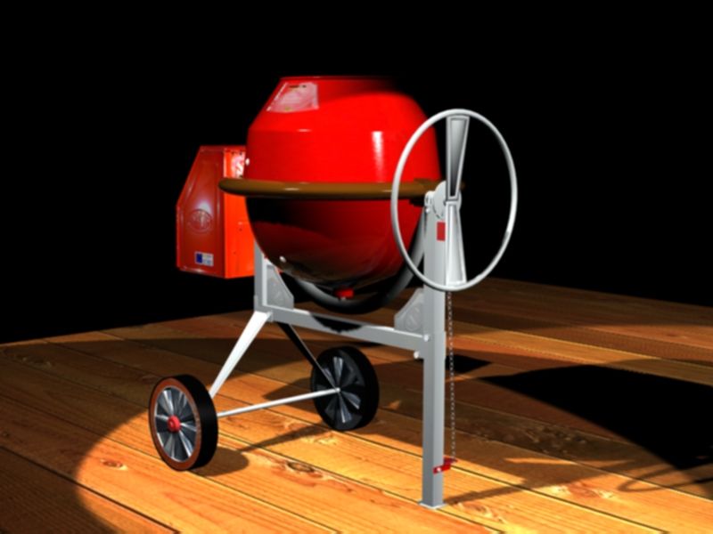 Si lo que estás haciendo es para algún tipo de campaña publicitaria, te aconsejo que seas lo más aséptico que puedas con respecto a las virguerías que te puede ofrecer max a fin de no despistar al receptor de la publicidad. Si es un mensaje sobre las diferentes piezas de la hormigonera, las sombras embarullan y ensucian la precisa información, eso sí, la sombra potencia la sensación de 3d, por lo cual, si quieres ponerla, usa una sombra muy suave, grisácea, no esa super negra que tienes puesta. Las transiciones así no serán tan bruscas y te garantizas la sensación de profundidad. En cuanto al fondo te recomiendo que sea blanco puro. Y la tarima de madera, mejor usa otro material que de sensación de más robustez, como un bloque de granito. (ese material se empatiza con la dureza de trabajo de una hormigonera, a la vez de servir de transición entre el fondo blanco y la máquina en sí).